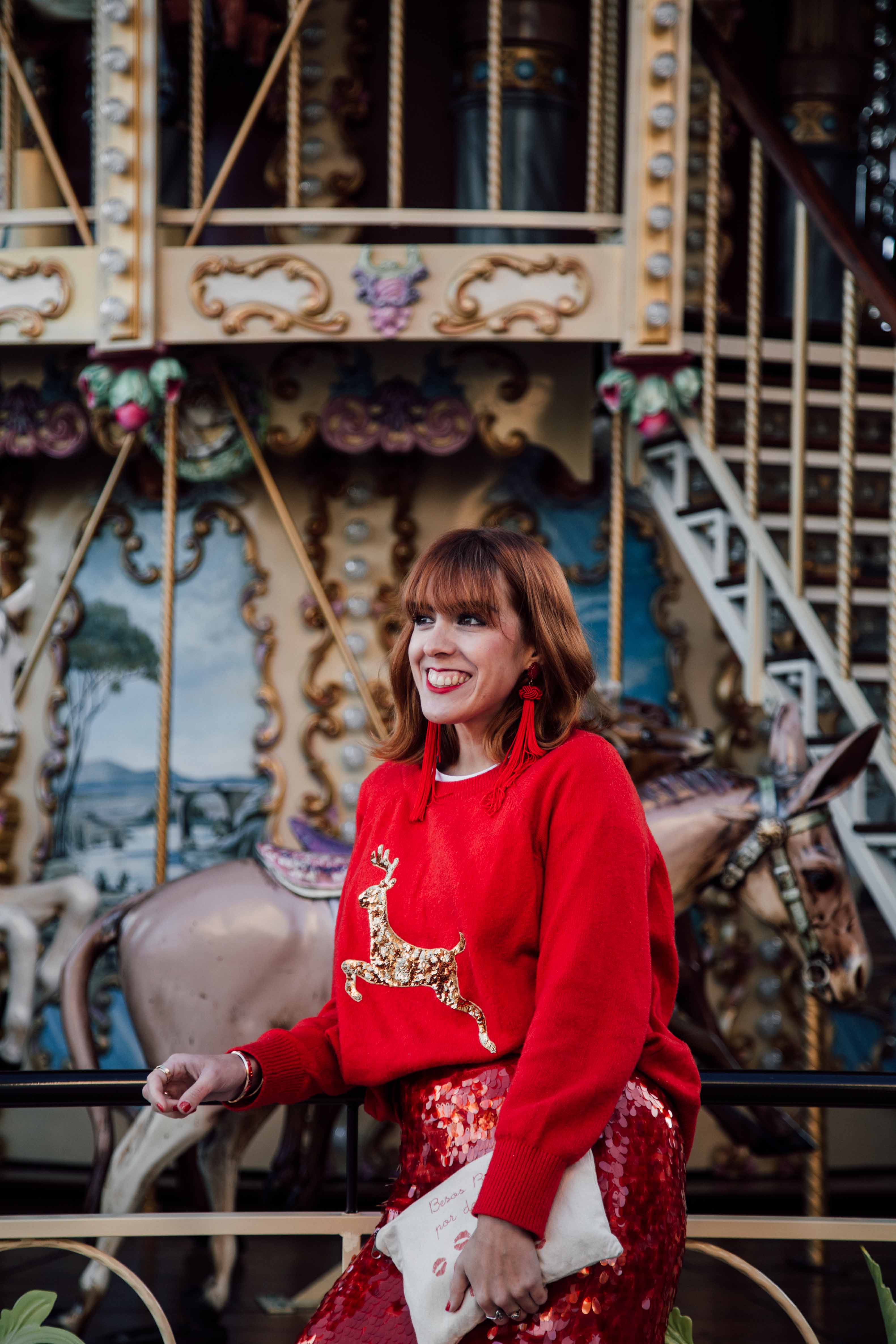 Respecto a la informal he decidido combinarla con Converse, quien dice Converse dice un par de zapatillas. Puedes admitir calcetín o no en tu look, ¡pero de lo que no te puedes olvidar es de un jersey de Navidad! Quería apostarlo todo al rojo así que he escogido este jersey rojo con un reno de lentejuelas doradas para una de las múltiples comidas de Navidad que vamos a tener estos días.